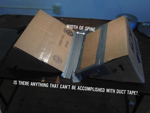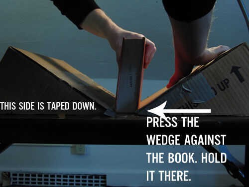 Establezca el libro entre las dos cuñas. Mover la cuña gratis restantes contra la columna vertebral de su libro.
