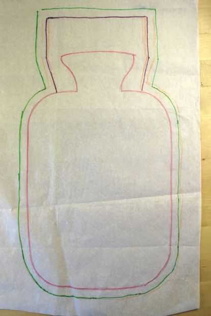 Sostener a lo largo sobre el área del cuello del dibujo y hacer algunas marcas que indican a lo ancho el cuello hay que insertar la botella doblada en medio cuando todo cosido.