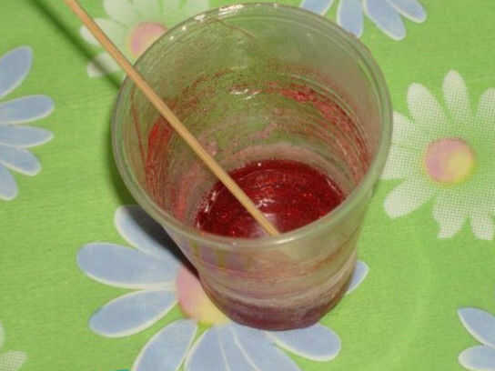 Tan pronto como se derrite la base de jabón, agregue el colorante y mezclar. Como he utilizado el pigmento rojo, además tuve que mezclar con 1/2 cucharada de aceite de almendras. Luego se deben agregar brillo y aceite esencial de geranio. Mezclar una vez más la base.