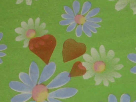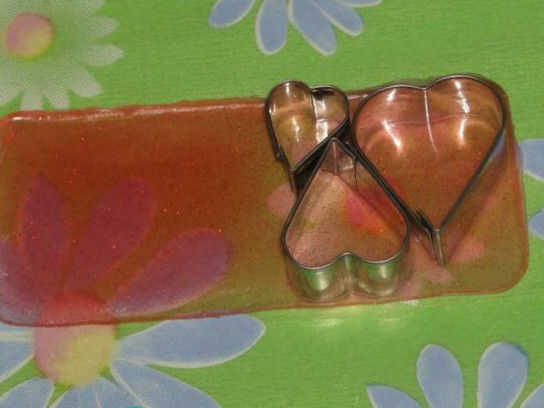 Tomar las latas en forma de corazón y recorta tres corazones de diferentes tamaños. También corte el resto de la capa de pedazos pequeños y ponerlos en un vaso de plástico con base roja para derretir nuevamente más tarde.