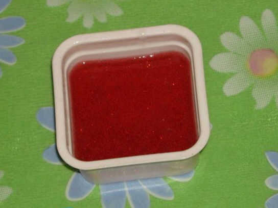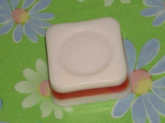 Derramar la mitad del base de jabón blanco en el formulario y agregar unas gotas de alcohol. Espere hasta que jellifies. Luego derretir la base roja y derrame en la capa de jabón blanco. No te olvides de añadir unas gotas de alcohol otra vez. Repetir las mismas acciones con el resto de la base roja. Añadir el alcohol. Tan pronto como todas las capas son etanol, tome el jabón de la forma.