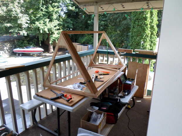 Los dos rectángulos con bisagras juntos hace esta jaula fáciles de transportar cuando derribado. Utilicé 3 bisagras, equidistantes, para los rectángulos, las bisagras y dos bisagras de la tapa. Los dos rectángulos con bisagras están conectados a los triángulos equiláteros por 6 tornillos y 6 tuercas 12 arandelas, todos de acero inoxidable.