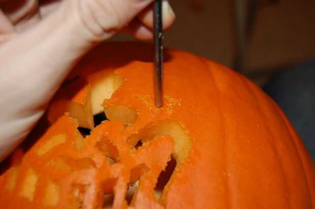 ¿Todo lo que tiene? Bueno, empieza la talla! En la mayoría de los casos, usted querrá comenzar en el centro de un patrón y trabajar hacia fuera de allí. En general, usted quiere asegurarse de que es uncarved calabaza en por lo menos un lado de la sección que está trabajando. Algunos patrones tendrá una sección muy detallada en el lado o en una esquina, en ese caso puede comenzar allí en su lugar. Trabajar en pequeños pedacitos de detallado primero, luego recorte las secciones grandes. Una vez más, sea paciente y tómese su tiempo. Gire la calabaza en su regazo para conseguir un ángulo mejor o una mejor vista de las líneas del patrón. Asegúrese de que su mano no descansa en la parte tallada.