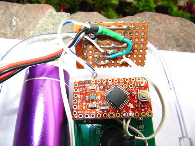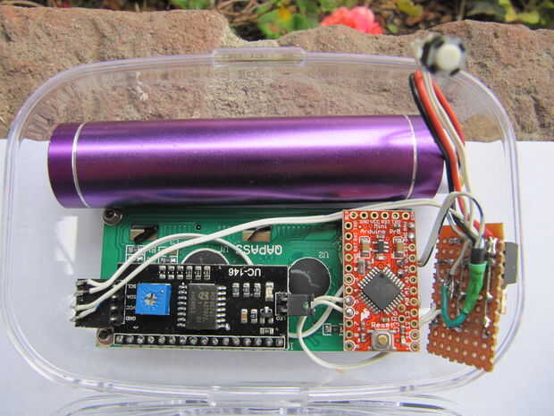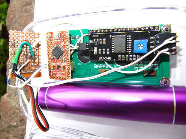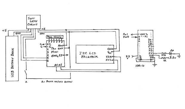 Desde la fuente de alimentación necesaria para el lcd con 5 voltios de alimentación, pero el HM-10 necesita 3,3 voltios, un Mini Pro con un regulador de 3.3 voltios a bordo fue elegido. Que simplificado nivel lógica interconexión entre el Mini Pro y el HM-10 e incluso a la mochila de I2C (componentes de I2C 5V pueden ser conectados a las líneas SDA y SCL de los 3.3V Mini Pro I2C-bus), mientras que todavía da el lcd 5 voltios para una visualización normal. Un banco de baterías USB común fue elegido para proporcionar 5 voltios porque es fácilmente recargable vía USB, encaja bien en el cuadro de proyecto (Jabonera) y vino un color agradable para mostrar a través del caso del plato de jabón transparente. Porque el espacio longitudinal es limitado en la jabonera, un conector USB fue reducido y alambres soldadas al corte conector (exteriores 2 pins) y extendido a la entrada de la energía de la placa de circuito de Softlatch.