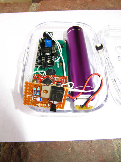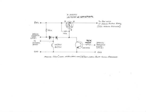 Pegamento caliente el Arduino Mini Pro a un pedacito de palito y pegamento caliente el palito para la pantalla para guardar el Mini Pro por encima de las pestañas en la pantalla lcd. Construir el Softlatch circuito de encendido-apagado en un pedazo de perfboard según el diagrama del circuito-crédito a Ardweeny y cable a tierra y Raw entrada del Mini Pro y control de líneas a los pines 5 y 6 del Mini Pro. El encendido/apagado principal botón de alambre y tierra a un botón montado caso. Pegamento caliente del circuito de Softlatch a la pantalla lcd.