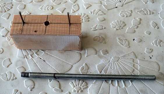 Un agujero en el centro para un ajuste de fricción de la pieza de trabajo, en este caso era una varilla de 1/4"(6.4 mm) de diámetro. Flanqueando, unidad en dos clavitos, sin cabeza, si está disponible, pero una caña lisa y mismo diámetro es lo que se desea. Conducen plomada y recto y también en su marca.
