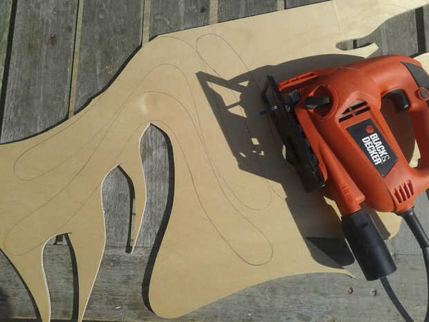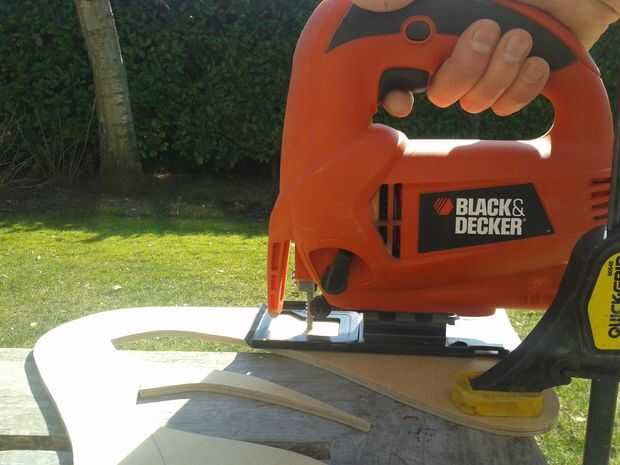 Trace la plantilla sobre la madera, la madera de la abrazadera hacia abajo y empezar a cortar! Si eres zurdo, el patrón del tirón hacia abajo (más adelante, verás por qué). Si su madera es saltar demasiado, utilice una hoja con dientes más pequeños. Ir lento y dejar que la hoja haga el corte por usted. Una vez que termines, toma el papel de lija grueso y lije los bordes para eliminar cualquier imperfección.