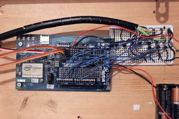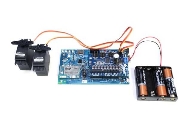Este circuito utiliza un protector de servo de Adafruit encima de la placa de desarrollo de Arduino de Edison. Además de los servos, hay 10 segmentos LED, que requieren de 12 voltios. Los LEDs y los servos requieren una energía más alta que lo que puede proporcionar el Edison. Una fuente de 6 voltios se conecta directamente en el escudo de sevo, recomiendo usar AAs que pueden tener 3 x tanta corriente como AAAs. Para los LEDs, utilicé 8 AAAs para mantenerla compacta. Cada segmento dibuja 120 mA (0,12 amperios), solamente un segmento se encenderán a la vez, para el suministro de 12 voltios también se utiliza para alimentar el Edison.