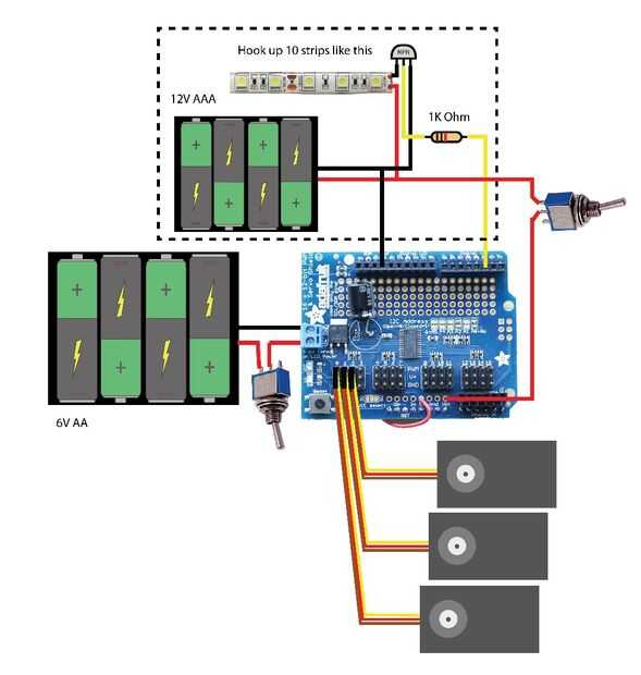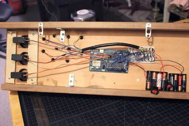 Para montar el circuito utiliza tornillos 4-40 a través de la placa de desarrollo arduino, atornilla las tuercas en la parte posterior y ajustaron las tuercas en la parte posterior de la cremallera para poder atornillar y destornillar el microcontrolador de él cada vez que necesitaba. Las tiras de LED fueron soldadas al circuito de transistor y el proto board fue atornillado en colocar. Después de la colocación, las líneas de los datos a cada pin digital, además de los + 12V y tierra fueron Unidas al escudo. Los servos conseguir su propio poder de 6 voltios con un interruptor en serie para encender y apagar. La fuente de 12 voltios es un interruptor de encendido/apagado así.