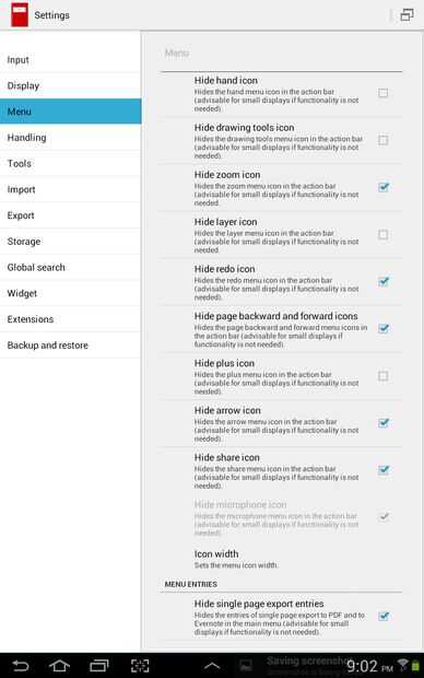 Ocultar acciones icono he desactivado esto porque no lo utilizo bastante, y también utilizar el menú de la aplicación para exportar a PDF antes de compartir algo.