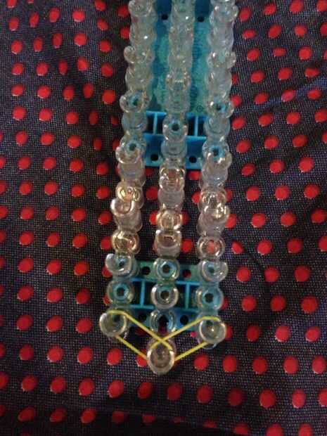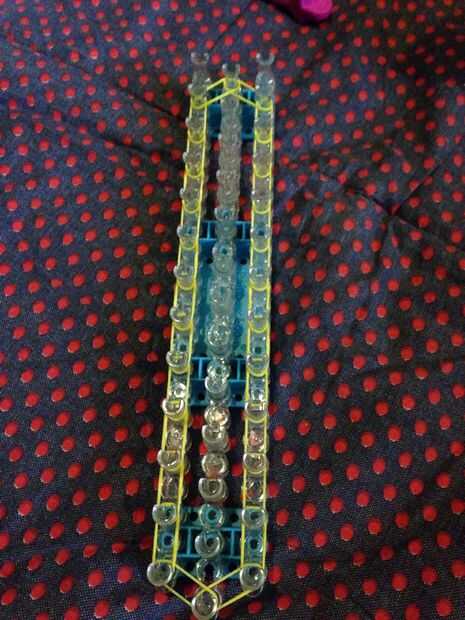 Inicio con la flecha de su telar hacia arriba. Haz tu primer color (amarillo) y poner de la primera clavija de media a la derecha. Entonces otra banda y poner de la clavija central a la izquierda. Coloque bandas subiendo 11 veces en ambos lados. Vaya de la clavija de la derecha a la mitad de ambos carriles. Hacer lo mismo con la izquierda. Empuje hacia abajo las bandas. Listo con el principio de colocar las bandas.