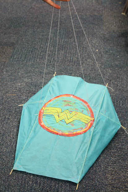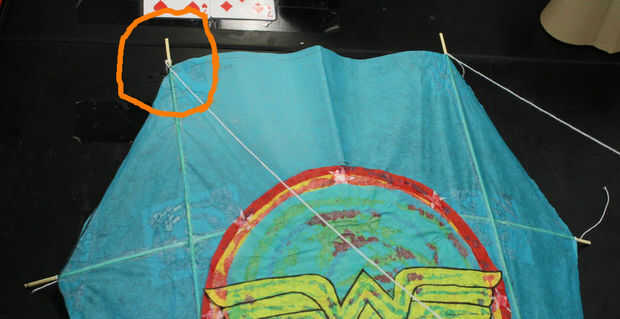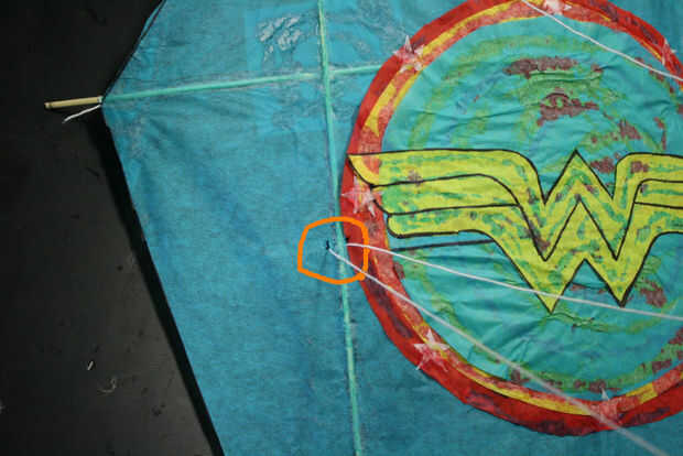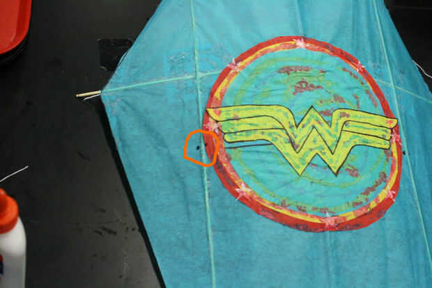 A continuación, tienes que meter 4 agujeros en la cometa para la cadena de novia. Mira la primera foto. Es un círculo naranja. Debe haber dos en cada lado, y cada conjunto de dos debe ser en lados opuestos de la spar de bambú.