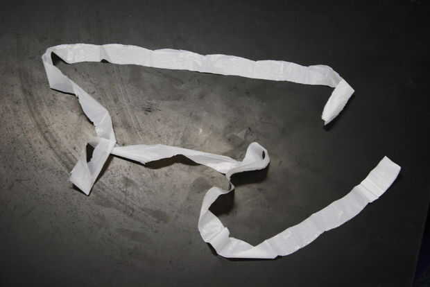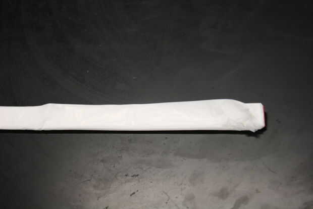 La bolsa de basura y enrolle lateral. Luego, cortar los extremos de la bolsa de basura y desecharlos. Cortar una pulgada del extremo de la rodada para arriba bolsa de basura. Una vez usted desenróllela, la tira larga se convertirá en la cola. Pegue cada extremo en los extremos inferiores de las vigas de bambú.