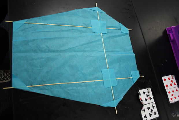 Cortar piezas de sobra papel azul para ir donde se superponen los largueros y en los extremos. Pegarlos a la cometa como se muestra en las fotos. Esto proporciona estabilidad y apoyo adicional.