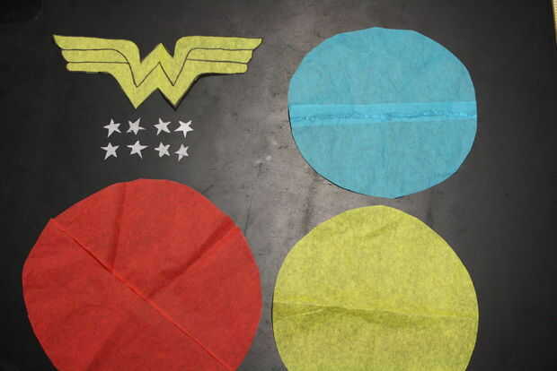 Cortar un círculo rojo más grande, una mediana, círculo amarillo y un círculo azul más pequeño. Después de eso, corte ocho estrellas blancas junto con el logo de Wonder Woman.