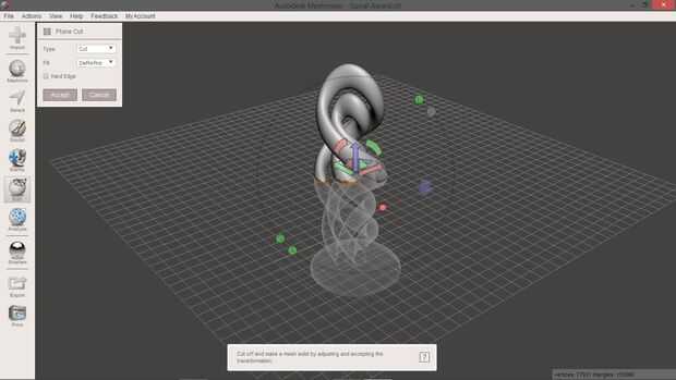 Si las proporciones de sus primeros premios no encajan bien en la base (objetos largos y flacos a menudo tienen este problema), entonces usted puede recortar su objeto en MeshMixer. Abra su archivo STL original en el programa y presione Ctrl + S para guardar en el formato MIX, que le permite hacer cambios sin revisar el STL original. Con el plano de corte herramienta (que se puede encontrar pulsando Edit), puede eliminar parte del modelo arrastrando el plano como en la fotografía superior. También puede hacer clic la flecha azul periférica para voltear la normal sobre el plano, haciendo que se corte en la dirección opuesta. Cuando esté satisfecho con el ángulo y la posición del avión, aceptar el corte.