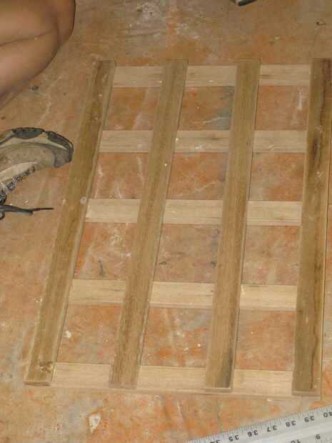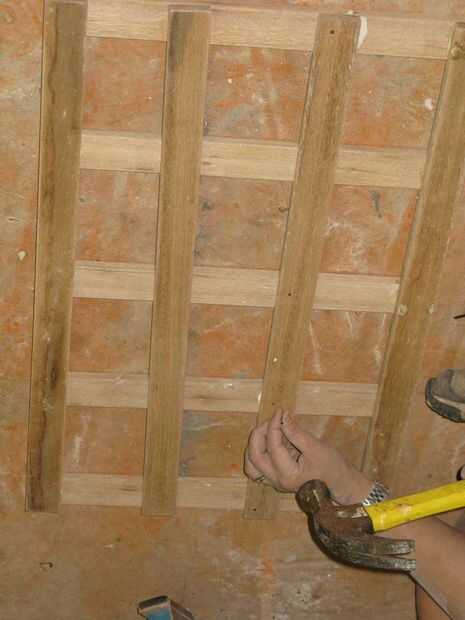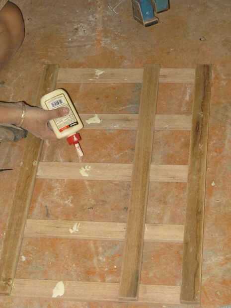Paso once: Dividir visualmente el espacio entre el tablero largo paralelo en terceras partes. Aplicar el pegamento y los últimos tableros largos en lugar.
