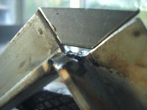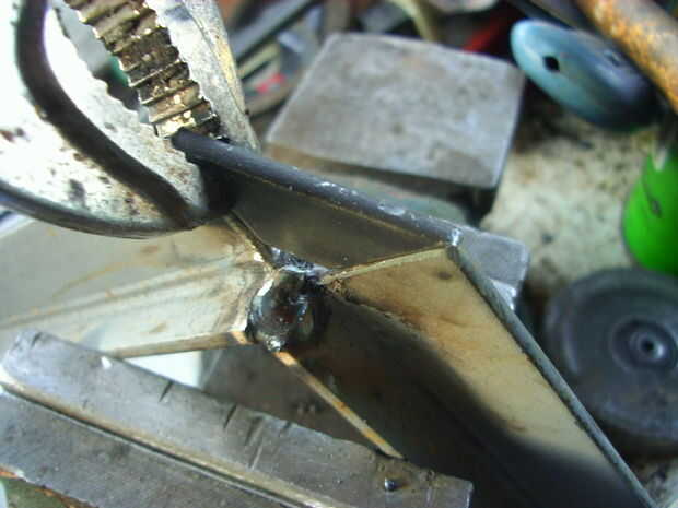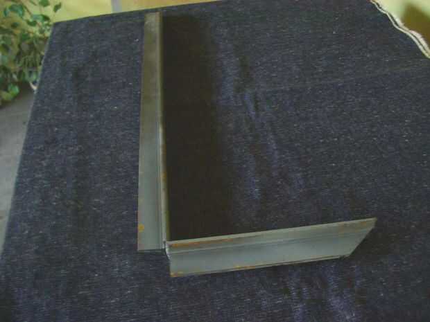 Decidí que mi abrazadera tendría una profundidad de garganta de unos 15 cm (~ 6 pulgadas), y conforme a lo que corte una costilla de hierro T. Doblado en ángulo recto y reforzado la Unión con un cordón de soldadura. Luego cortar una pieza trapezoidal de acero 1/2 pulgadas x 1/8 y soldado con autógena entre los dos lados de las costillas que se separaron.