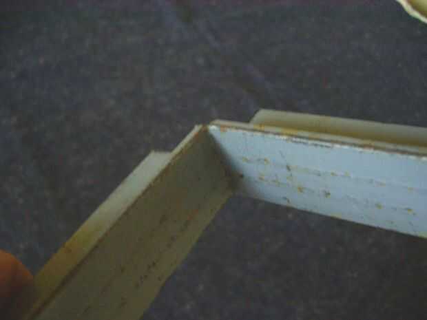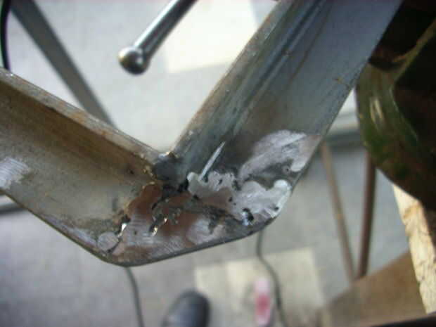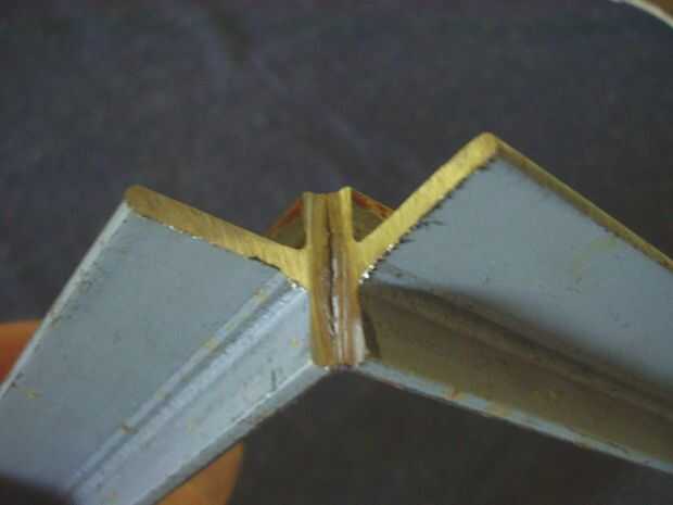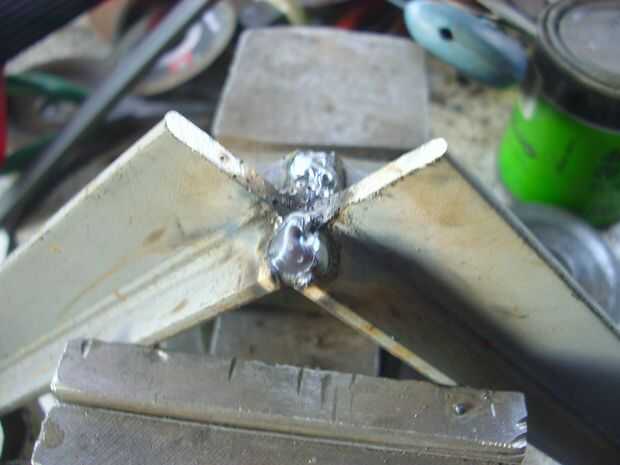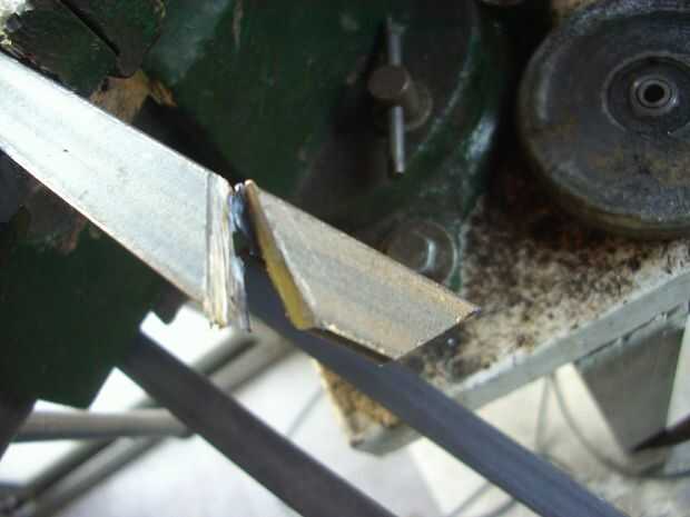 Decidí mi prensa tendría una profundidad de garganta de unos 15 cm, y de acuerdo a eso hice un corte en uno de los trozos de hierro T, pecado llegar a separar totalmente la parte cortada. La doblé en ángulo recto y reforcé con soldadura la articulación. Luego corté un trocito trapezoidal de varilla de 1/2 pulgada x 1/8 y lo soldé entre las dos partes de la nervadura quedaron separadas.