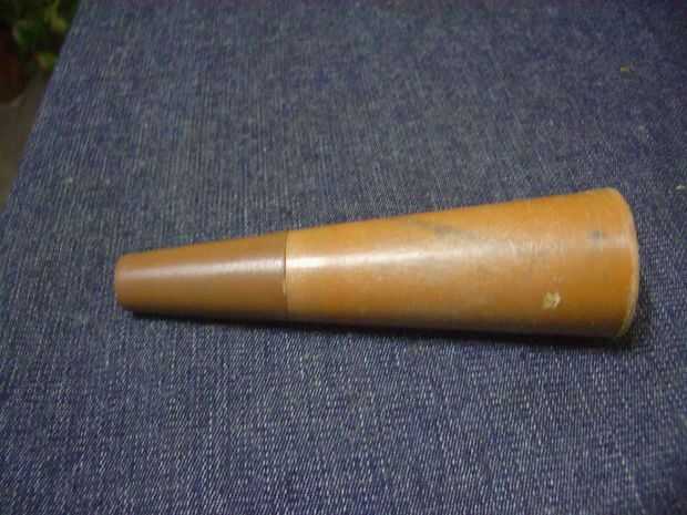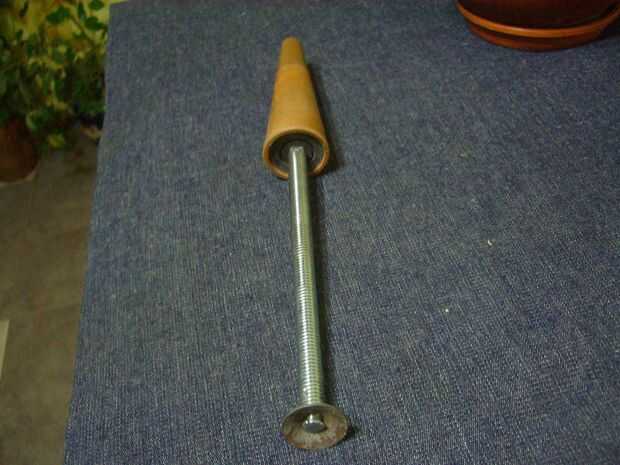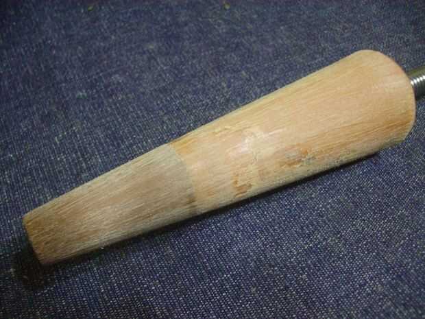 Entre las cosas que guardo, encontró una clavija cónica muy viejo de un gabinete de cocina de plástico duro. Hice un agujero de 8 mm en la base del cono, y con la lima triangular marca aproximadamente la plaza donde debe introducir el cuerpo del tornillo. Me calienta el extremo cuadrado del tornillo en la estufa de gas y presionar en el mango, que forma el agujero cuadrado. Como la superficie de cono plástico era muy suave, para darle agarre yo papel de lija lo longitudinal con lija áspera. Mejoró substancialmente.
