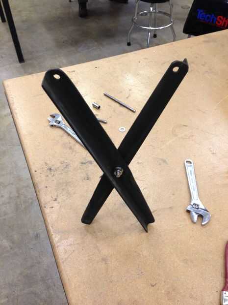 quiero hacer las barras de la Cruz tanto como sea posible para montar justo debajo del tornillo y que se extienden casi hasta el suelo. En mi chuleta de 32" por ello las barras de 17" de largo. Que usando hierros de ángulo para esto para prevenir la flexión en cualquier dirección. Molió a un lado de cada uno hasta 1" de ancho y luego usando una sierra de cinta metal cortar los otros lados para tener un mayor en el medio (1 1/2") y 1" en cada extremo. Entonces los agujeros fueron perforados, cada 5/16". Las barras se cuelgan de la parte superior y atornilladas en el centro, los fondos se flotar hacia arriba como se abre la prensa y hacia abajo como se cierra.