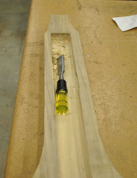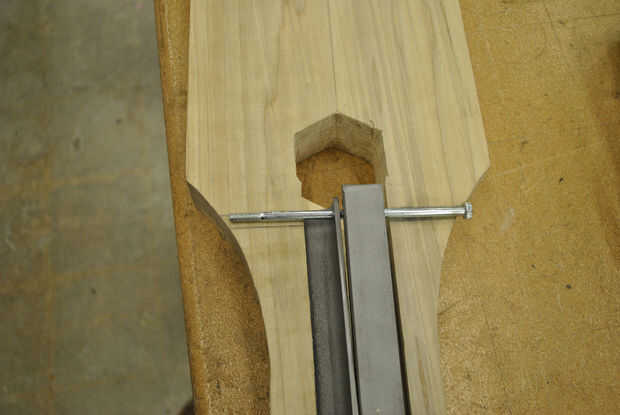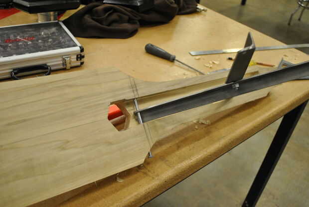 Un canal debe ser excavado en la tajada y la pierna del Banco para acomodar la Cruz. Puesto que las barras son una pulgada de ancho, los canales deben ser 2" de ancho y 1" de profundidad. Puesto que las barras cruzan, todavía hay espacio para la altura extra en el medio. Utiliza un router para la mayor parte del canal del cerdo luego limpiar con un cincel. A continuación el 5/16" a través del agujero es perforado para el pivote. Usé una broca Forstner y un taladro para esto para mantener el hoyo recto y perpendicular como sea posible.