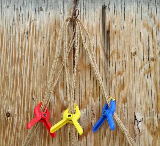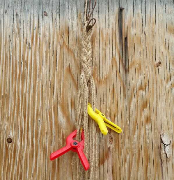 Corte 12 piezas de hilo de yute 90 pulgadas (2,3 m) de largo. Doblar por la mitad y cuelgue de un gancho de alambre o clavo como se ve en la foto 1. Separe la cuerda en tres grupos, cada uno con 4 soportes y trenza de toda la longitud (Foto 2). Hacer un nudo al final, como se ve en la foto 3.