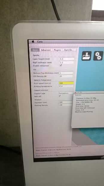 Después de terminar el diseño se exporta el archivo a un archivo .stl para la impresora 3d. Se abrió entonces el fichero .stl con Cura, un programa para enviar archivos a la impresora 3d de Ultimaker y cambiar la configuración de impresión. Estos son los ajustes que utilicé: