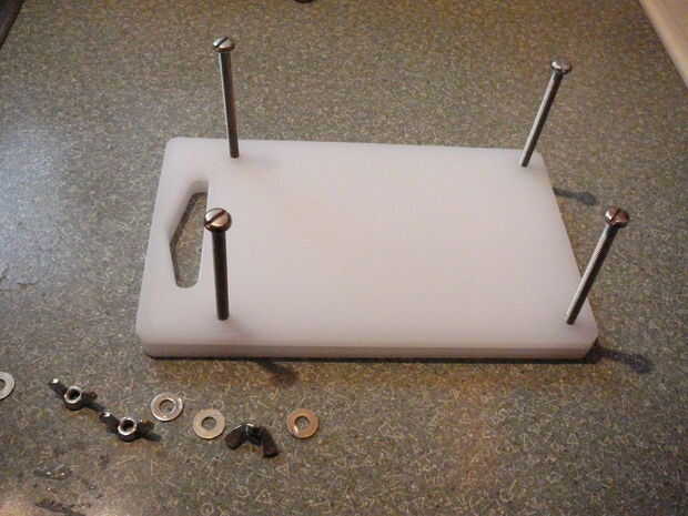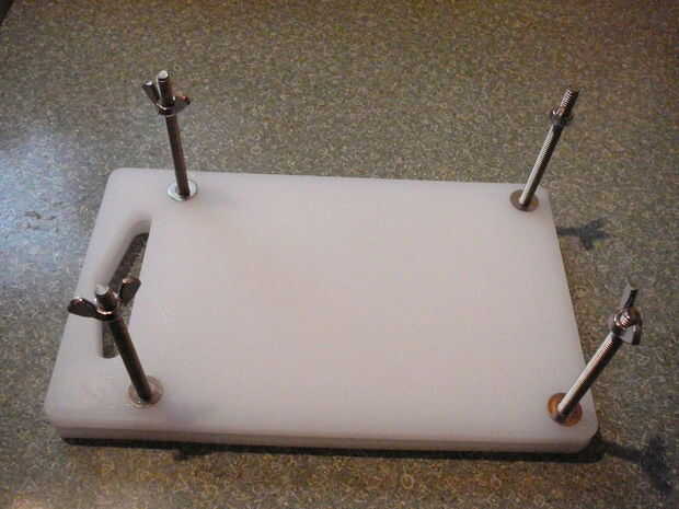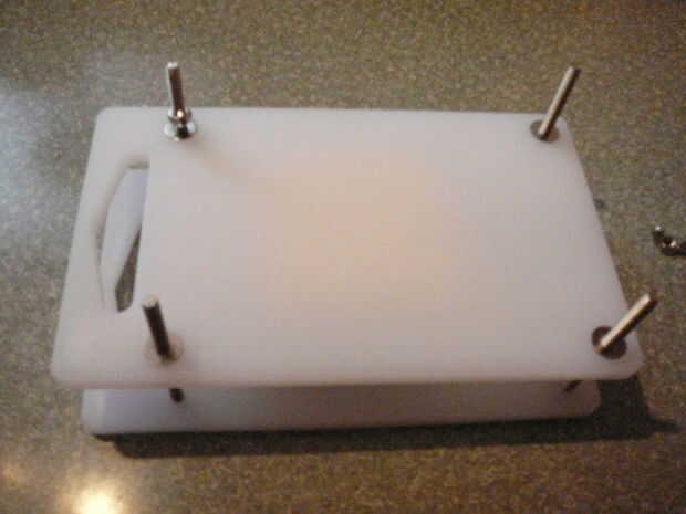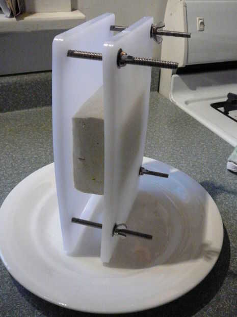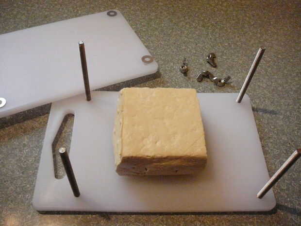 Sólo tengo un bloque de tofu en este momento y ya es firme, por lo que pude meter el bloque entre las juntas entonces apretar los pernos uniformemente hasta que el bloque sostenido y algunos líquido hacia fuera nuestro. Si tienes más tofu, ponga los pernos a través de un tablero, en posición plana sobre mostrador, poner tofu a bordo entonces lugar segundo tablero en la parte superior. Agregar arandelas planas y tuercas de mariposa, apriete uniformemente.