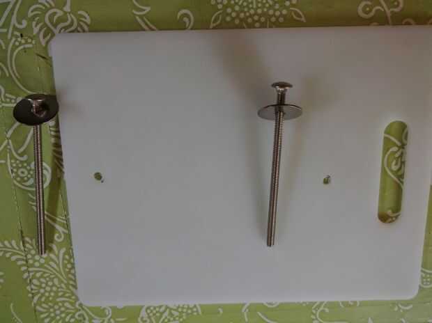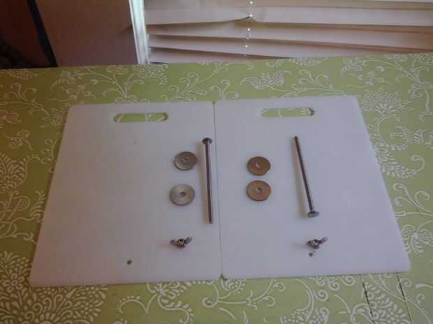 Taladrar un agujero en cada extremo de la prensa (no en la foto, la luz en mi sótano no es muy buena). Poner una arandela en el extremo de los pernos y deslice a través de ambas tablas.