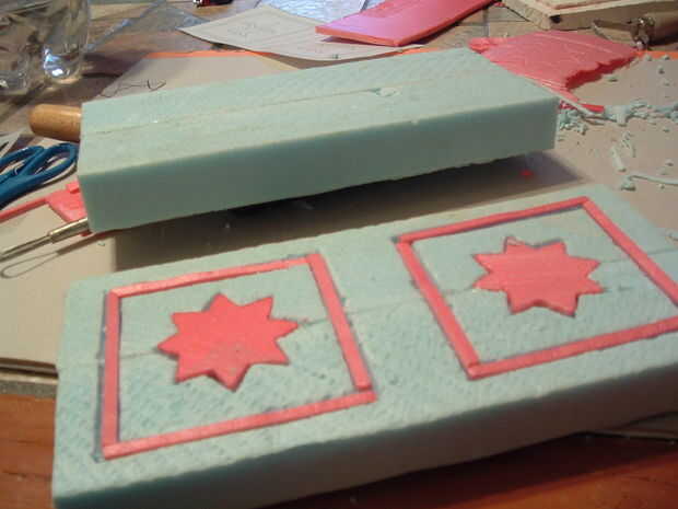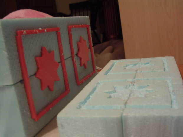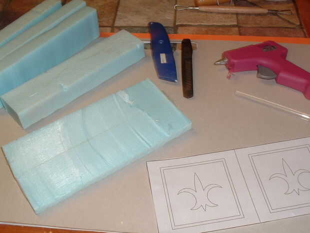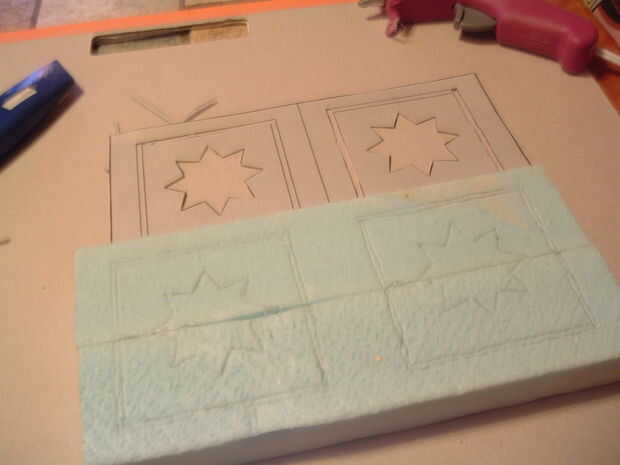 Imprimir una plantilla o crear su propio para guiar y un diseño de corte en los bloques de espuma de 8,25 "x 3,75". Aquí está el enlace esta plantilla para su uso en Google Sketchup. Si usted hace su propio diseño, querrá costillas de algún tipo como parte de ella para fortalecer el azulejo. Las plantillas hizo tener dos casillas que son las costillas. Cortar las características de la espuma muy cuidadosamente con un cuchillo o exacto o navaja filosa. La profundidad de la huella debe poco profunda, aproximadamente 1/16". Un cartón de huevos poliestireno es sobre el grosor adecuado, una bandeja de carne es demasiado gruesa.