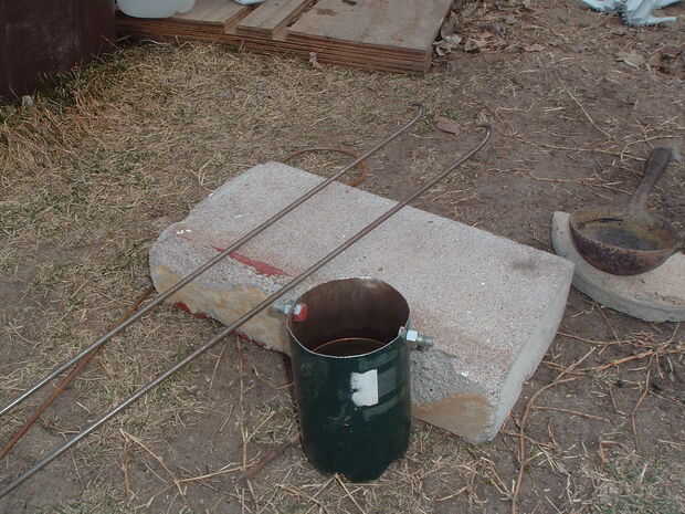 De un crisol, una 14 oz botella de propano se utiliza; la parte superior fue cortada y algunos pernos fueron agregados para tomar el crisol con las pinzas. Hice algunas herramientas básicas con alguna chatarra de acero de un viejo somier de cama. Necesitará pinzas para crisol, una especie de gancho de shepard a punta el crisol y una barra simple con un poco de la curva en la punta para meter cosas y raspados a la escoria (impurezas en el aluminio).