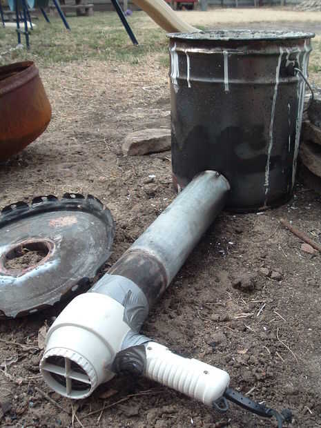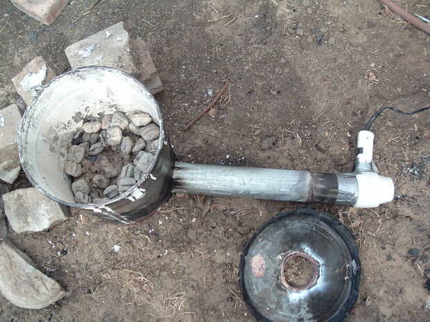 Las siguientes imágenes muestran un balde de 5 galones de metal, un pedazo de estufa de tubo, secador de pelo y alguna cinta para barato un horno de fundición. Se corta un agujero en la parte inferior de un cubo de metal para colocar el tubo de estufa. Se corta la parte inferior del cubo del metal otra aproximadamente 2 pulgadas desde la parte inferior; un montón de agujeros se perforan en esa pieza y la insertamos en el cubo principal como una parrilla ardiente. Mantenga cubo las tapas, una tapa deben tener un agujero en él para la grabación y la otra tapa de ventilación debe ser izquierda sin cambios para sofocar el fuego. El secador de pelo debe tener el botón de "frío" con cinta para usar como un soplador; cinta de la secadora en el tubo de la estufa.