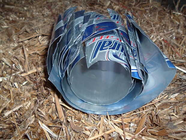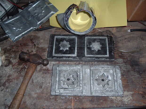 Colocar una hoja entre los dados para hacer un sándwich pequeño. Le dan unos raps ligeros con un martillo de bola hasta que usted sienta la deformación de la lata. Abrirlo y ver el azulejo; Si usted muere no son perfectos, que esto puede tomar algo de práctica y algunos ajustes de dremel hasta que todo funciona. En realidad mi sello todavía rasga y rompe las latas a menudo, creo que tiene algo que ver con los ángulos agudos del diseño.
