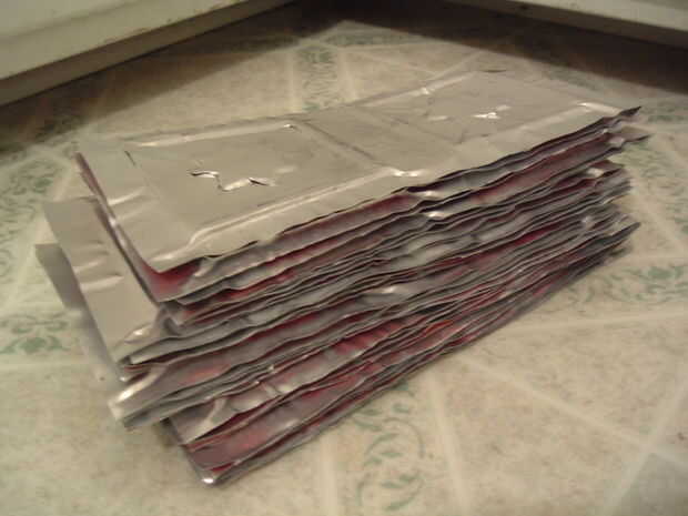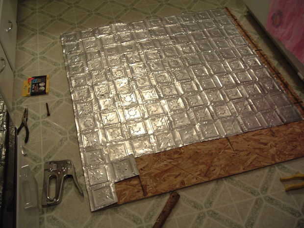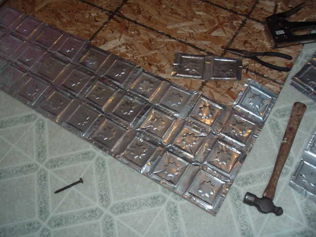Estos son muy fáciles de hacer los azulejos que se pueden utilizar en construcciones simples o donde necesita una cubierta. Te hace falta:Montón de latas de aluminio, todo el mismo tamaño.Varias piezas de madera sobrante para hacer el molde que va se