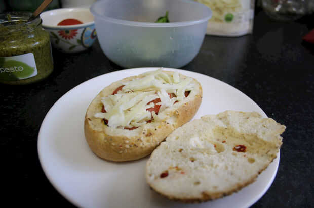 Pizza con Pesto de pollo arty bárbaro.Las combinaciones sin fin que se sientan tan bien en la cima del pan de parmesano Cheezzy. Esta pizza de fusión particular enorgullecería Colón el descubrimiento.Paso 1: ingredientesJuro que eres en Italia en el
