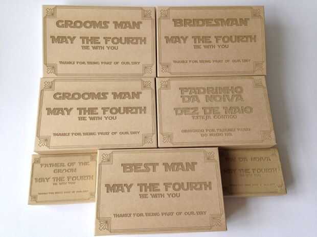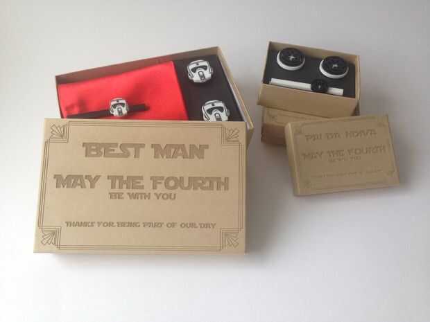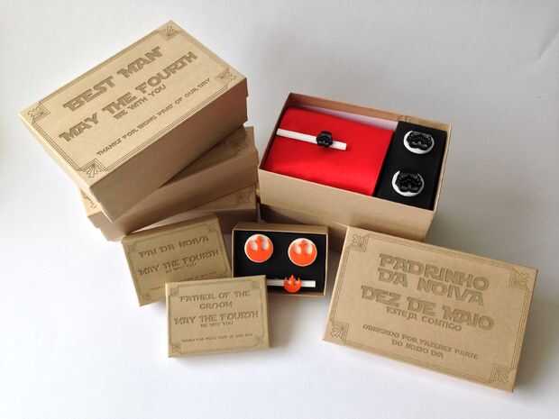 una de las maneras que estamos incluyendo es a través de los regalos que estamos dando a los hombres en la boda. vamos a darles un pequeño set de regalo de mancuernas y una corbata que sea de alguna manera star wars temática, en el set de regalo incluirá también la boda fiesta corbata y pañuelo de bolsillo (para los que llevar a nuestros colores, novia y novios padres llevar a sus propios lazos)