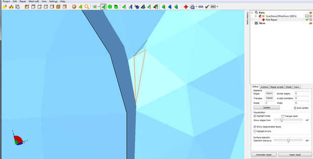 Las estadísticas en de Netfabb' ventana de estado ahora está buscando mucho más alentador. Pero aún así, algunas pequeñas caras degenerados. Netfabb en naranja uso destaca la acción 'Quitar caras degeneradas' para corregir estos. Nuevamente, esta es una acción donde un valor demasiado alto puede causar distorsión a su modelo, use una tolerancia muy pequeña para comenzar con - utilicé una tolerancia de 0.005 a retirarlos.