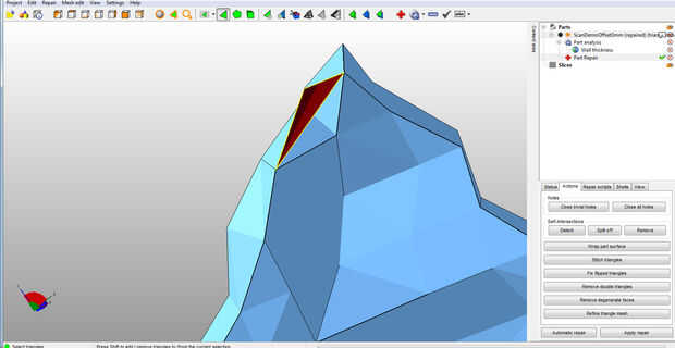 Puede haber algunas áreas en el modelo que son claramente no imprimibles: flotante triángulos casi sin grosor, por ejemplo. Aquí he quitado un mal triángulo haciendo clic en el icono de triángulo verde en la barra de herramientas superior para seleccionar triángulos individuales, luego con la tecla Supr del teclado para quitarlo.