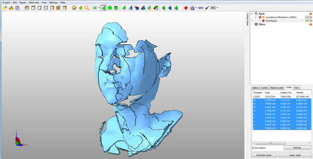 El retiro de uno mismo-intersección dio lugar a una serie de pequeñas conchas quedando en el modelo. En la pestaña de 'Conchas', seleccione todas las conchas debajo de principal y eliminarlos (puede tanto utilizar el botón Delete en el teclado o haga clic derecho y seleccionar 'Quitar triángulos seleccionados.')