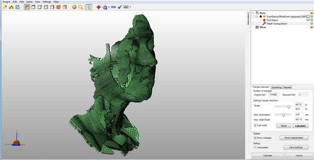 En este punto, debe tener un modelo que consta de una sola cáscara, con ningunos agujeros u otros errores. Sin entrar en el modelo de reparación, haga clic en Extras -> reducción de triángulo. Esto le llevará a la pantalla anterior. Deslice el control deslizante superior marcado 'Target' a la izquierda, hasta su triángulo aparece a la derecha es bajo cuenta máximo triángulo para la impresora 3D que va a utilizar. Haga clic en 'Calcular' para ejecutar la reducción de triángulo, luego OK si estas contento con los resultados.