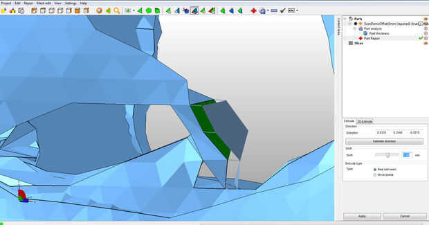 Aquí, estoy usando la función de extrusión de Netfabb para ligar áreas delgadas. Primero seleccioné los triángulos individuales, luego elegir Edit Mesh -> extrusión de superficies. Puede introducir manualmente un valor en mm para extruir el área seleccionada para añadir espesor.