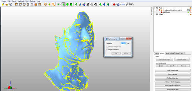 Haga clic en la pestaña de 'Acciones' y haga clic en 'Puntada triángulos'. Esta función busca cantos abiertos que están muy juntas pero desunidas y 'puntadas' les juntos. Una tolerancia que es demasiado alta será resultado en triángulos se agrega en el lugar equivocado, así que elegir el menor valor posible. El número correcto eliminará las líneas discontinuas amarillas en su modelo, sin cambiar la forma de su modelo de ninguna manera. Puede que necesite ejecutar esta función más de una vez, aumentando gradualmente cada vez. El número real que utilice variará dependiendo del tamaño de tu modelo, pero yo suelo utilizar una tolerancia de .5m m o inferior.