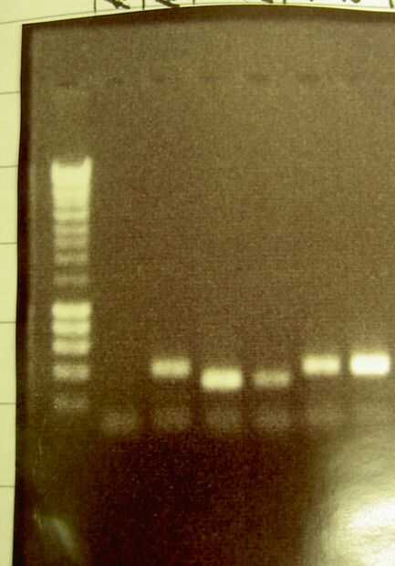 La imagen es un gel de agarosa de una PCR, el ADN se añade a los pocillos y un movimientos corriente eléctrica a través del gel, pequeños bits pueden menear más rápido a través de así mover más. En la izquierda es un marcador de peso molecular de digerido fago ADN, las bandas se conocen tamaños así pueden ser utilizados para juzgar el tamaño de nuestros productos PCR. Bromuro de etidio se añadió el gel por lo que el ADN se puede visualizar con rayos UV.
