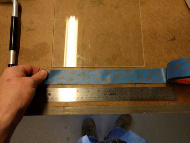 1. Con las tijeras corta tiras de cinta azul que son aproximadamente 1.5" más de la placa de pyrex.