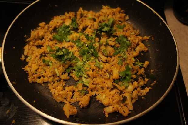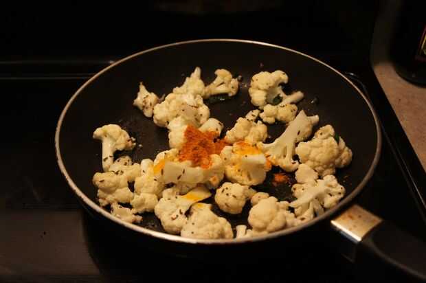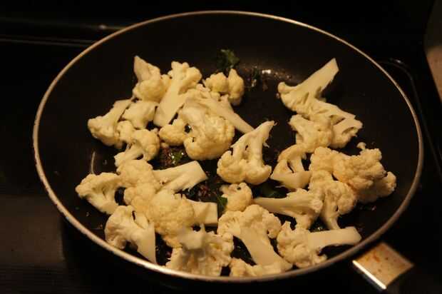 3) una vez que escupe, añadir la coliflor y saltear hasta que llega a ser suave.