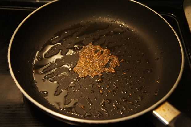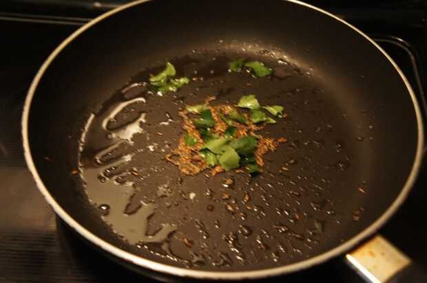 2) Coloque una cacerola a fuego medio, agregar el aceite, semillas de mostaza, semillas de comino y hojas de curry.