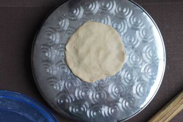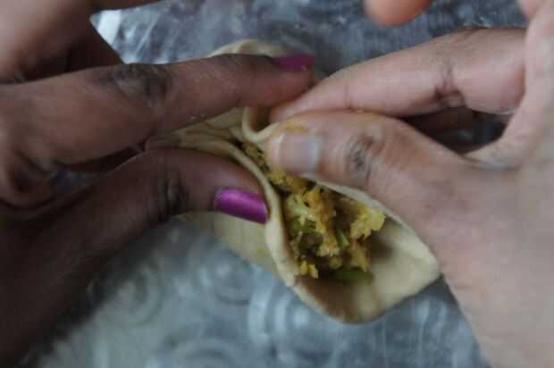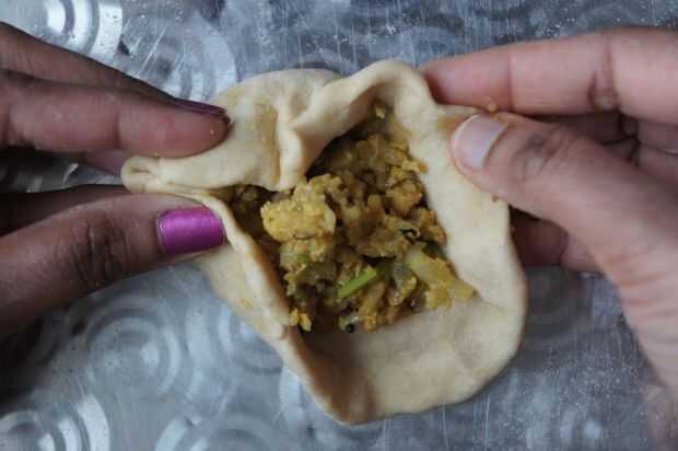7) tomar el una bola de masa, hacer un pequeño círculo y mantener un pequeño relleno en el centro y sellar asegurado.