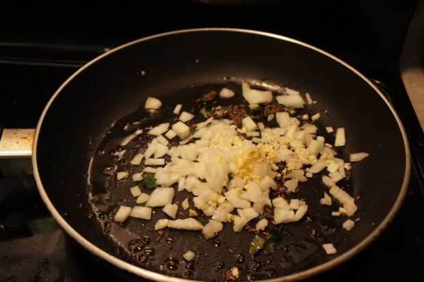 3) una vez que escupe, añadir las cebollas, ajo, jengibre y saltear hasta la cebolla llega a ser suave.