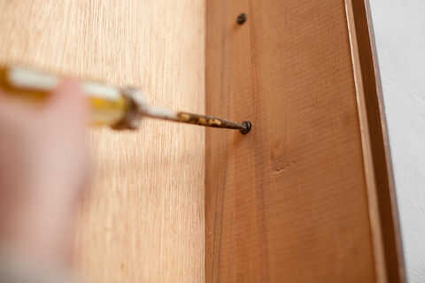 Quitar el hardware. Llene los agujeros con masilla para madera. Asegúrese de seguir las instrucciones en el producto de relleno de madera y arena agradable y suave.